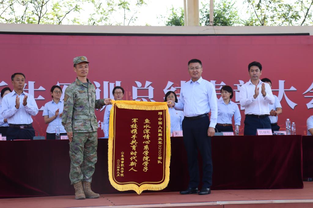 副校长仉继航宣读《山东海事职业学院关于表彰2024级新生军训优胜连队、优秀组织连队、军训优秀标兵的决定》,参会领导为获奖单位和个人进行颁奖。
