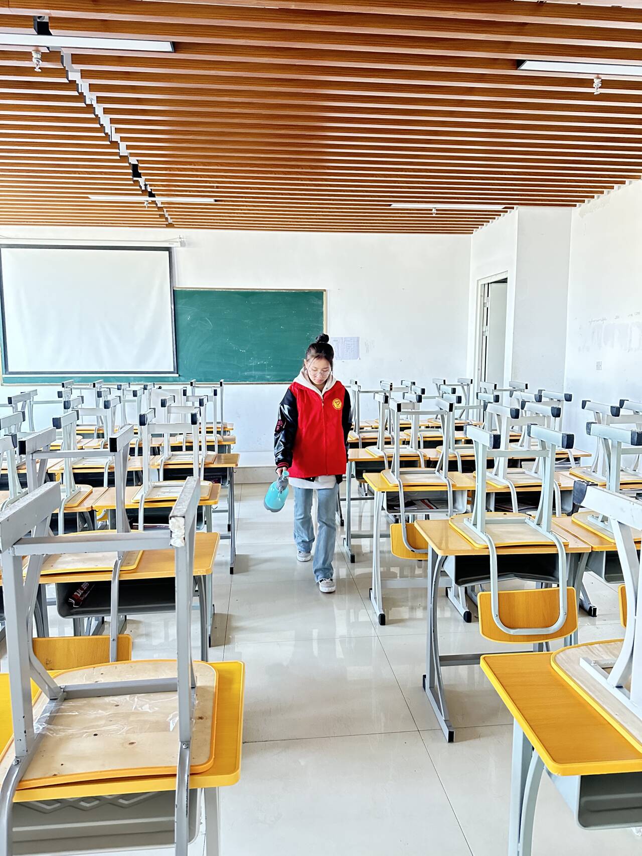 在教室里,志愿者们分工明确,分为擦拭桌子,讲台,消毒三部分。为确保一尘不染,志愿者们不放过任何一个卫生隐患,对教室的各个角落进行细致的消毒喷洒。
