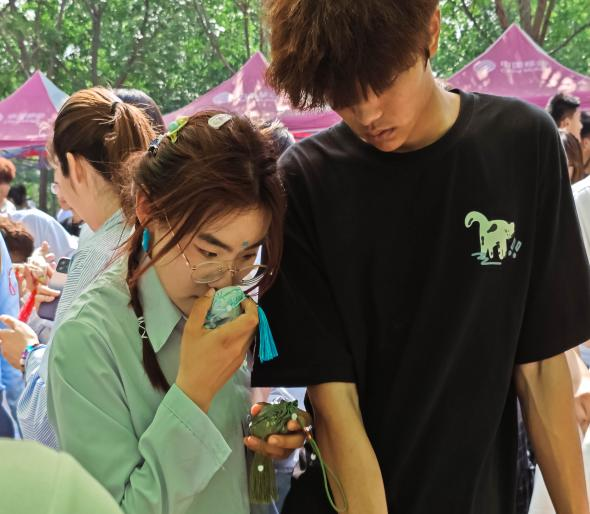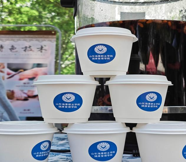 在中药文化展示区,每幅作品都是由学生亲手制作,上演了一场穿越时空的“海上中药丝绸之路”文化之旅;展台上陈列着"潍九味"道地药材,以及师生精心制作的中药手工艺品和特色香囊,师生们纷纷体验不同配方香囊对舒缓情绪、提神醒脑的独特效果;最受欢迎的是传统中药饮品制作区,师生们亲手熬制酸梅汤、杞菊茶,在氤氲药香中聆听专业老师讲解这些药饮的历史渊源和保健功效。