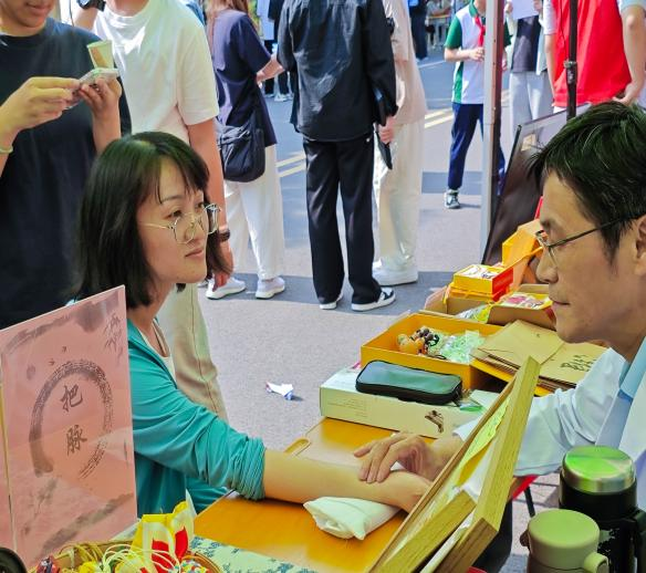 活动现场,在中医保健服务区,前来体验的师生排起了长队。学院特邀潍坊市机关医院国医堂专家魏永刚教授及其团队为全校师生提供免费义诊服务,通过望闻问切准确判断体质类型。推拿体验区,中医养生推拿社团的学生为全校师生提供免费推拿按摩服务,得到了全校师生的一致好评。