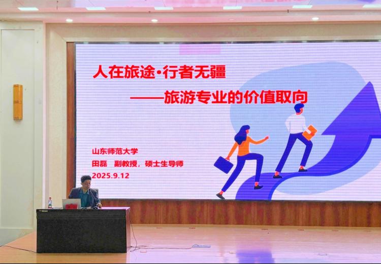 上午,田磊老师以《人在旅途,行者无疆——旅游专业的价值取向》为题,面向旅游管理、酒店管理与数字化运营专业全体新生作报告。他从旅游的本质出发,结合行业发展趋势,指出旅游不仅是经济行为,更是文化体验和人文交流的重要方式,鼓励同学们拓宽视野、增强跨文化沟通能力,成为有责任感和创新精神的行业人才。