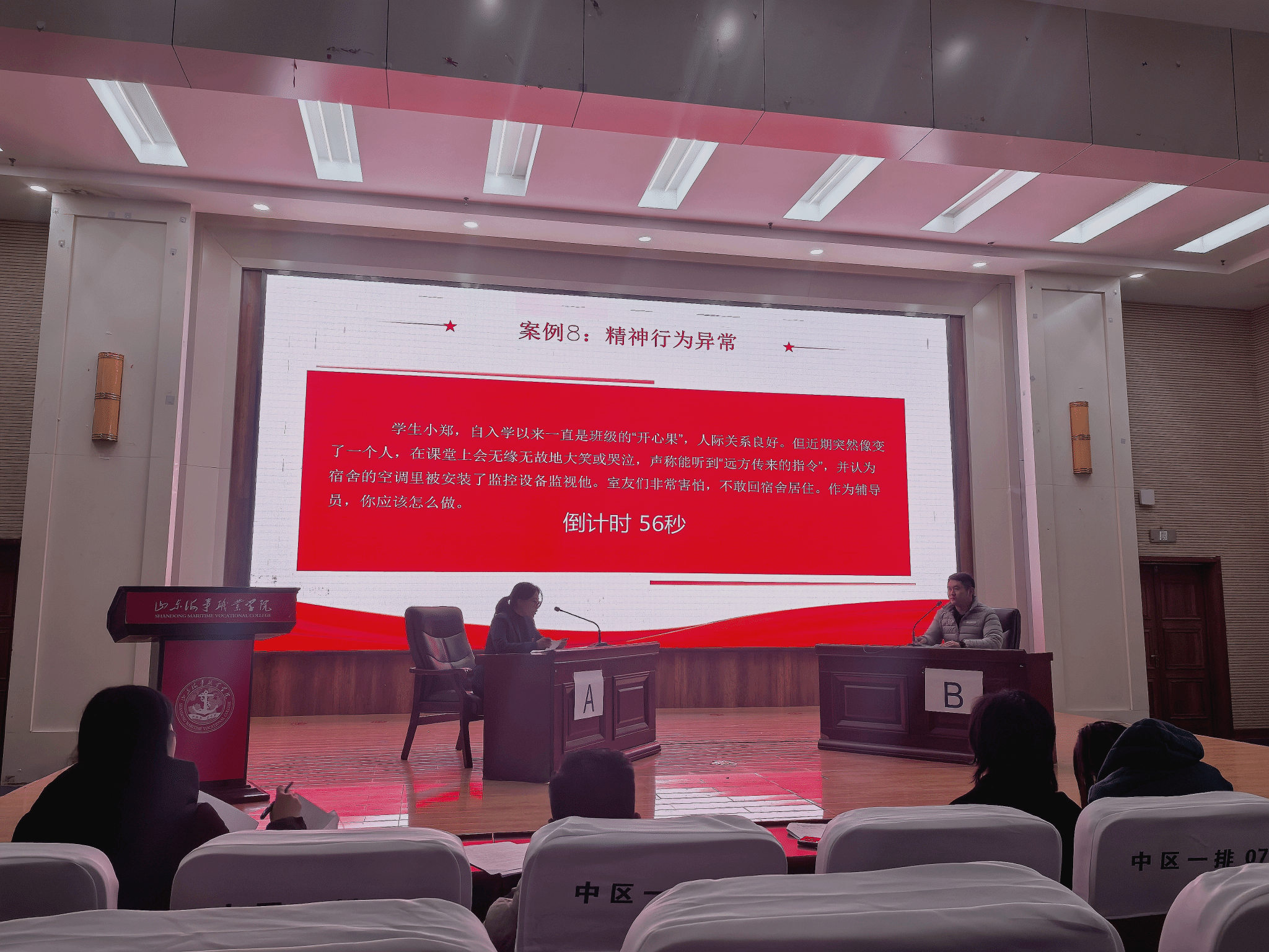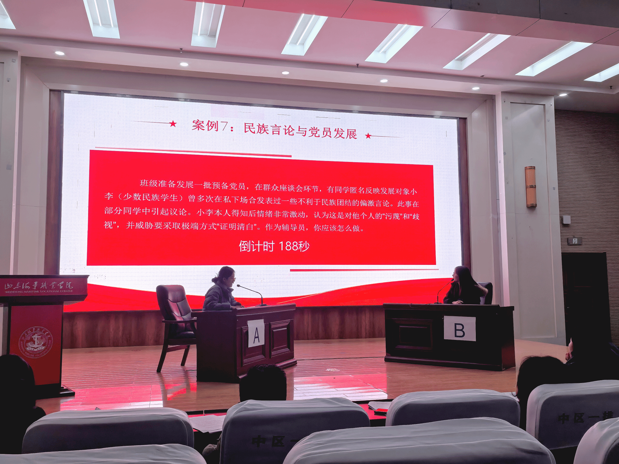 刘璇老师抽到一道关于“民族言论与党员发展”的难题。她迅速进入角色,通过引入自己所带学生的相似案例,以知心姐姐的姿态,运用共情与倾听技巧,巧妙地引导学生正视困难、重拾信心。她将思想价值引领贯穿于对学生的关怀与鼓励之中,其富有感染力的表现赢得了现场观众的认可。