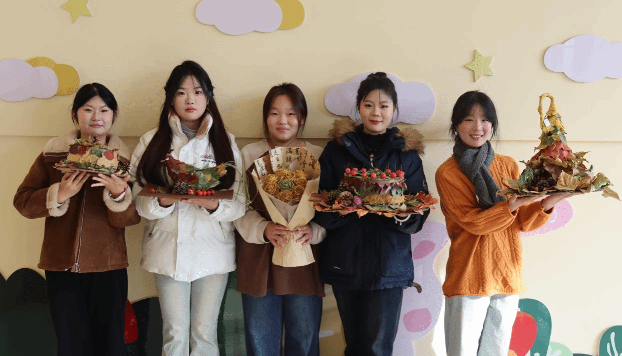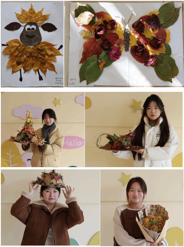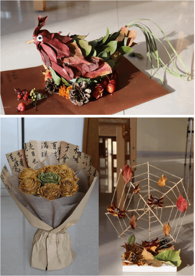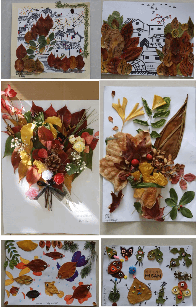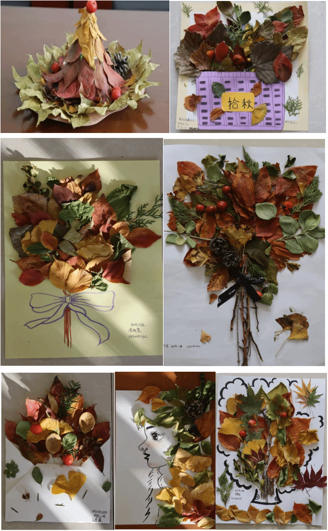 活动启动作品征集后,2024级托育专业全体学生积极响应、踊跃参与。在校园林荫道、花坛边搜集多样落叶素材,紧扣0-6岁幼儿认知发展规律与教学实际需求,精心创作兼具安全性、趣味性与教育性的手工作品。缤纷叶材拼叠出活灵活现的小生灵,细碎自然物料错落勾勒出绘本里的温柔场景,每一件作品都尽显巧思,既彰显环保理念,更体现善于发现的学习智慧。